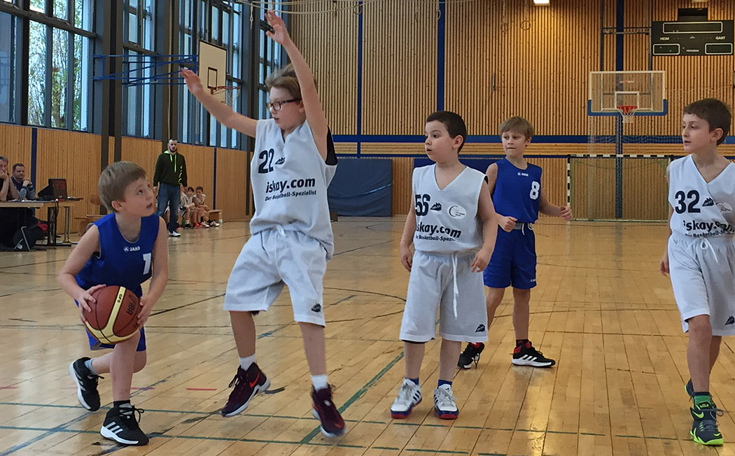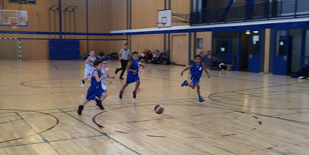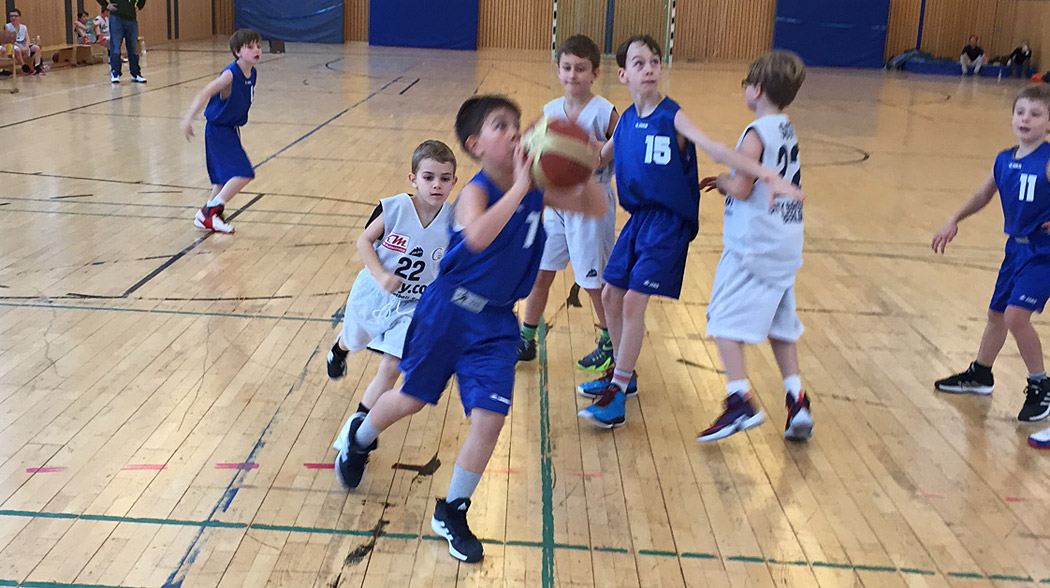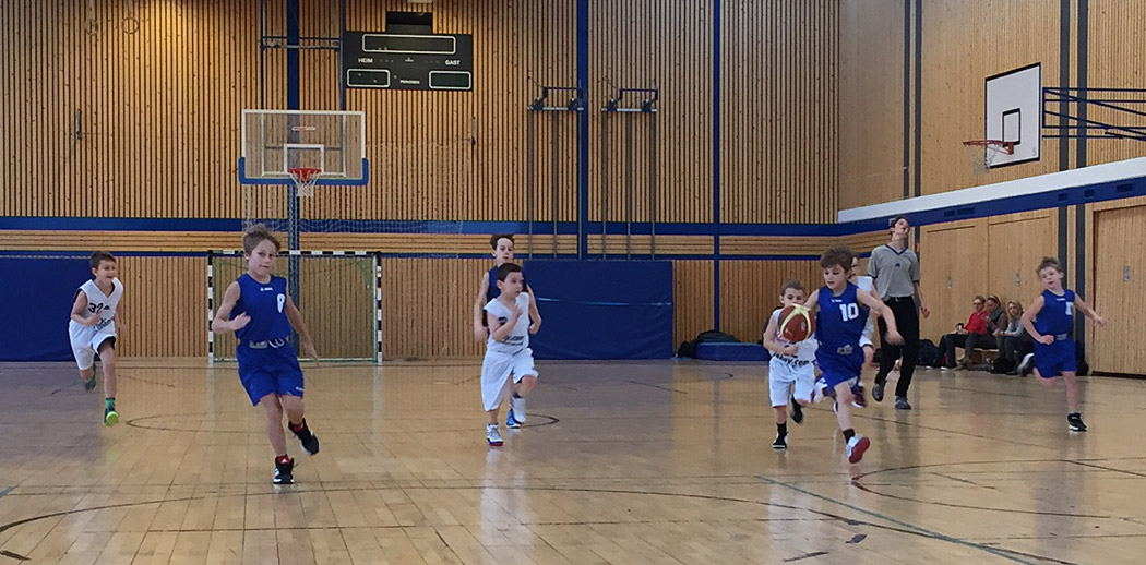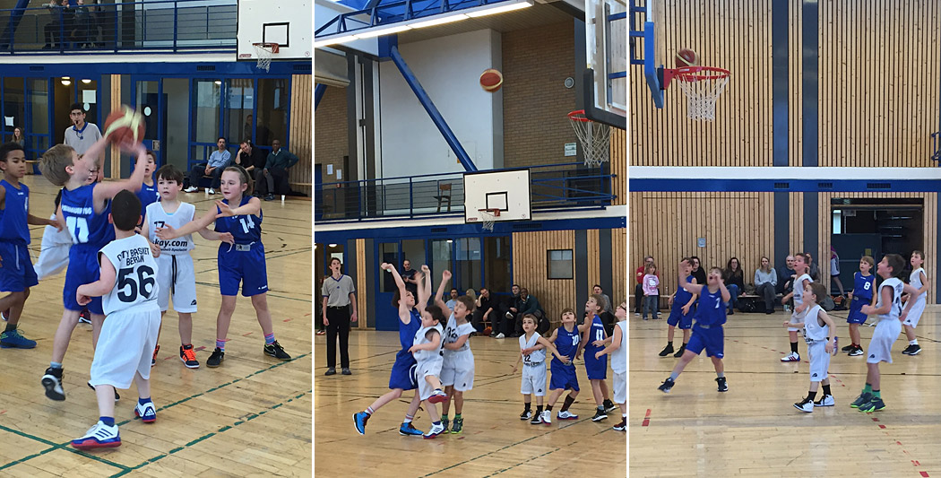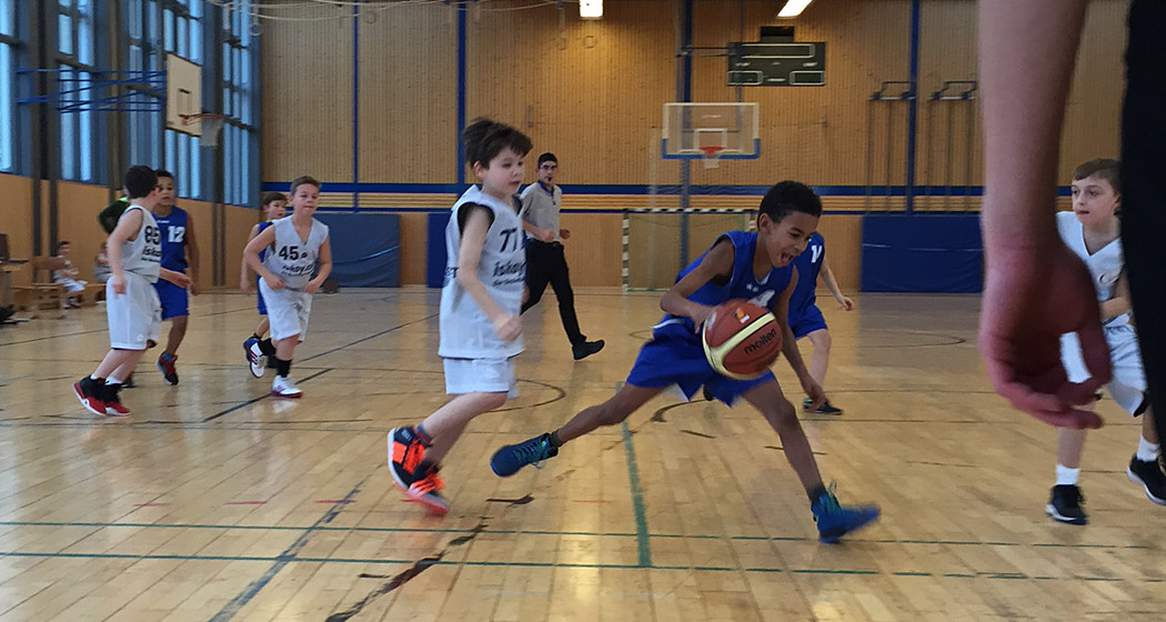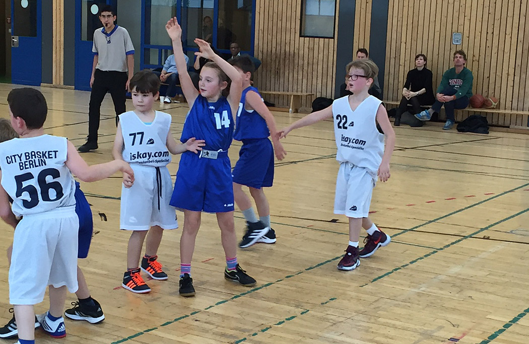 Von da an spielten sich die Friedenauer so richtig in Fahrt. Lenny, Milan und Mathéo machten schöne Korbleger, alle zusammen verteidigten toll und ließen kaum noch einen Korb des Gegners zu. Der kleine Sam blockte sogar einen Wurf seines Gegenspielers, der mindestens einen Kopf größer war als er! Und dann wurde Febe, das einzige Mädchen bei den Mammuts, wunderbar unter dem Korb angespielt, und sie machte in ihrem erst zweiten Spiel ihren ersten Korb in einem Punktspiel! Toll! Im letzten Zehntel hörte ich dann, wie der Friedenauer Coach seinen Kindern sagte: Versucht’s mal ohne Dribblings! Nur noch Passen! Die Kinder schauten erst entgeistert, legten sich dann aber mächtig ins Zeug. Erst ging’s ein wenig holprig, das mit dem Sternschritt und dem Freilaufen will halt auch gelernt sein. Aber dann klappte es immer besser, und schließlich konnten die Mammuts noch drei Körbe erzielen, der Endstand war 56:23.
