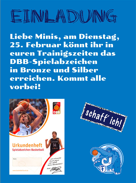 Einladung für unsere Minis zum DBB-Spielabzeichen. KommentarnavigationZurückVorheriger Beitrag:U10 Team Weiss: Sieg gegen KöpenickNächstesNächster Beitrag:U10 Team Blau: Sieg gegen TusliRelated PostsGeschützt: Mammut Basketball Camps in den Schulferien 20251. Oktober 2025Basketball interessierte Frauen aufgepasst1. September 2025Mitgliederversammlung 202528. Januar 2025Mammut Basketball Camps in den Herbstferien9. September 2024Friedenauer FLINTA* Basketball Open Gym2. Mai 2024Macht mit beim 3×3 Turnier bei „Friedenau im Frühling“ am 4. Mai13. April 2024