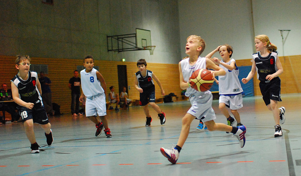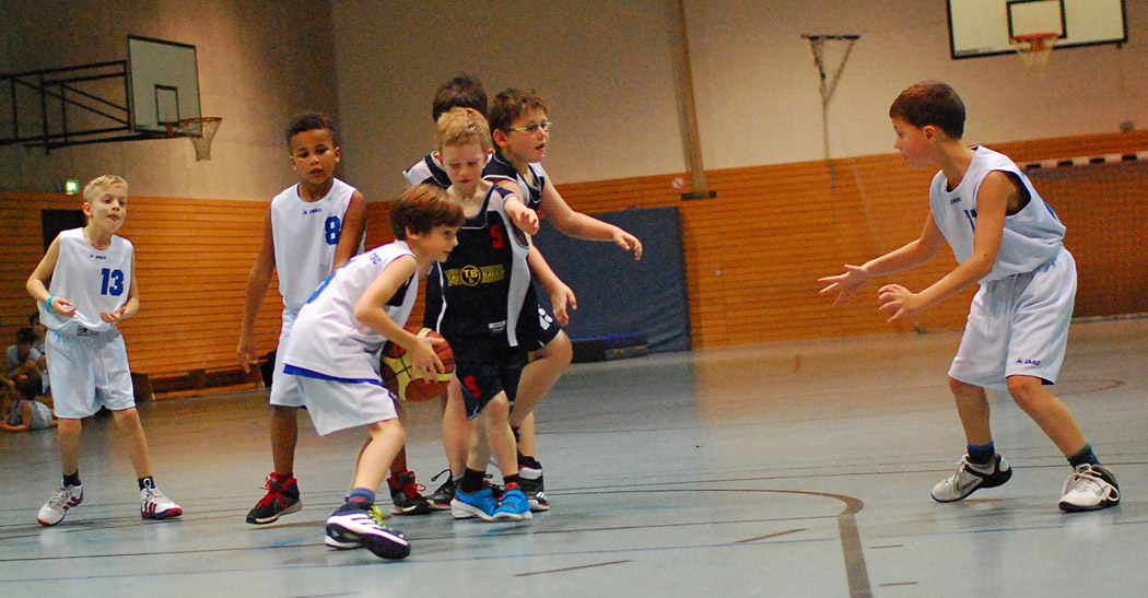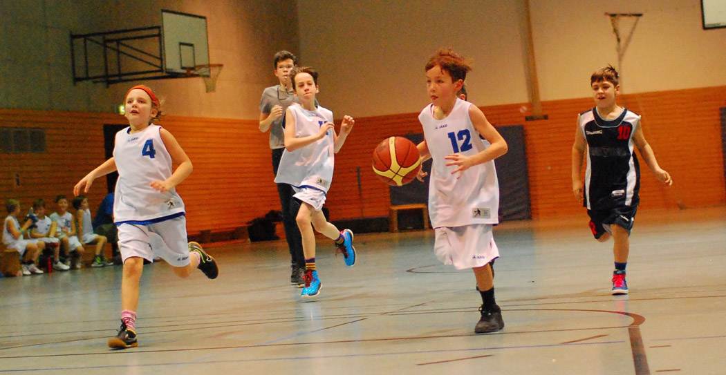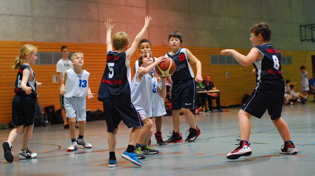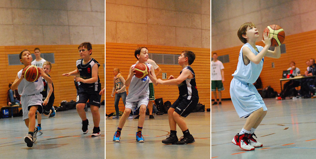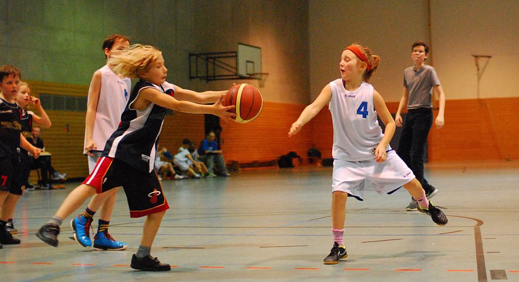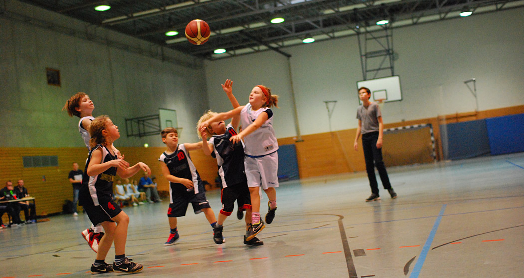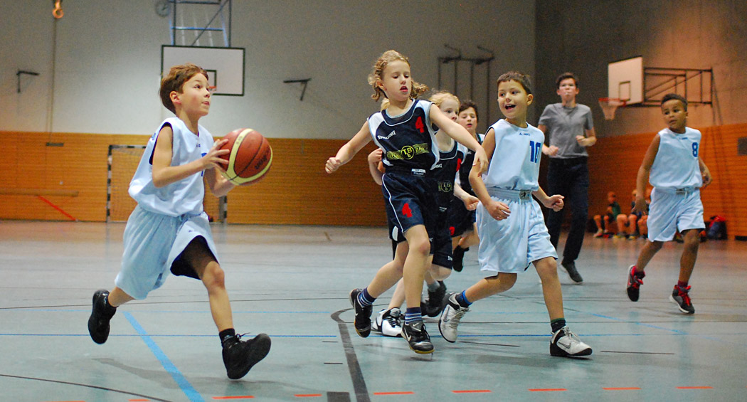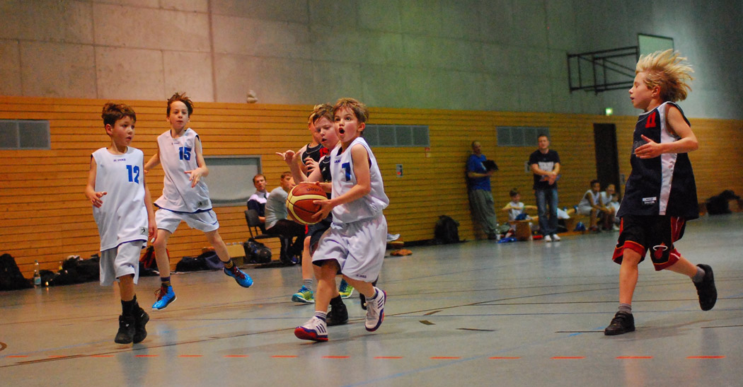 Doch das erste Zehntel begann wie ein Feuerwerk – ganz im Gegensatz zu den Kollegen von der U9F, die am selben Morgen recht verschlafen ihr Spiel begonnen hatten, legten diese Mammuts gegen Köpenick gleich richtig los! Erste Aktion: Felix versenkt sicher einen Fastbreak-Korbleger! Die Kids zeigen tolles Passspiel und viel Engagement in der Defense, es steht 8:0. Das zweite Zehntel beginnt, und das ist nicht nur Febes erstes Zehntel überhaupt, sondern auch Ragnars erster Auftritt in diesem Spiel! Und was für ein Auftritt! Ragner ist überall gleichzeitig! Er klaut Bälle, macht einen Korb, holt Rebounds, spielt tolle Pässe und eine fabelhafte Verteidigung. Mit 16:4 geht es ins dritte Zehntel! Doch in der Pause scheinen die Mammuts versehentlich tief in den Eimer mit dem Wurfpech gegriffen zu haben – der Korb ist mit einem unsichtbaren Brett vernagelt! Die Friedenauer erarbeiten sich eine gute Wurfchance nach der anderen, aber es will einfach nichts mehr durch den Korb fallen. Zum Glück ist die Defense nach wie vor wachsam, auch Köpenick gelingen nur zwei Punkte. Doch die Köpenicker wittern ihre Chance! Mit einigen guten Aktionen können Sie das vierte Zehntel 7:4 für sich entscheiden. Insbesondere bei den langen Einwürfen sind die Mammuts oft nicht wachsam genug und rennen oft nur hinterher. In dieser Phase begeht Febe übrigens das erste Foul ihrer Basketballkarriere, und zwar ein recht „gutes“, wie Basketballer sagen, denn sie verhindert damit einen sicheren Korbleger des Gegners. Im fünften Zehntel wogt das Spiel hin und her, und jetzt ist es Caine, der den Unterschied ausmacht: Mit seinen Steals und zwei sicheren Korblegern sichert er die Friedenauer 24:13-Führung zur Halbzeitpause. Gut gemacht!