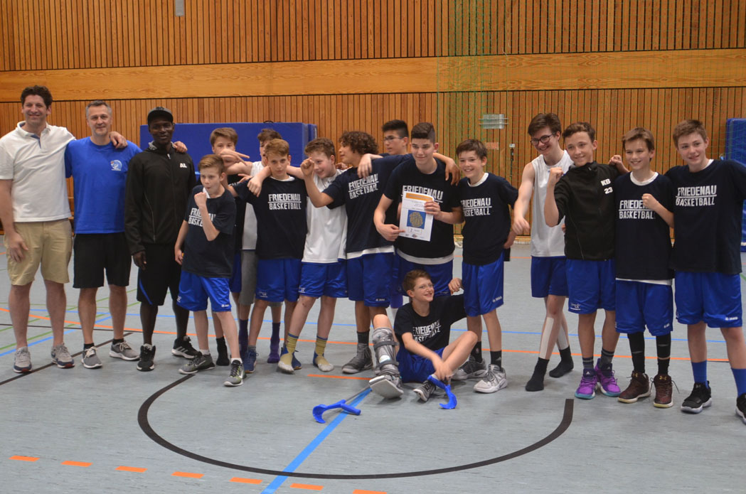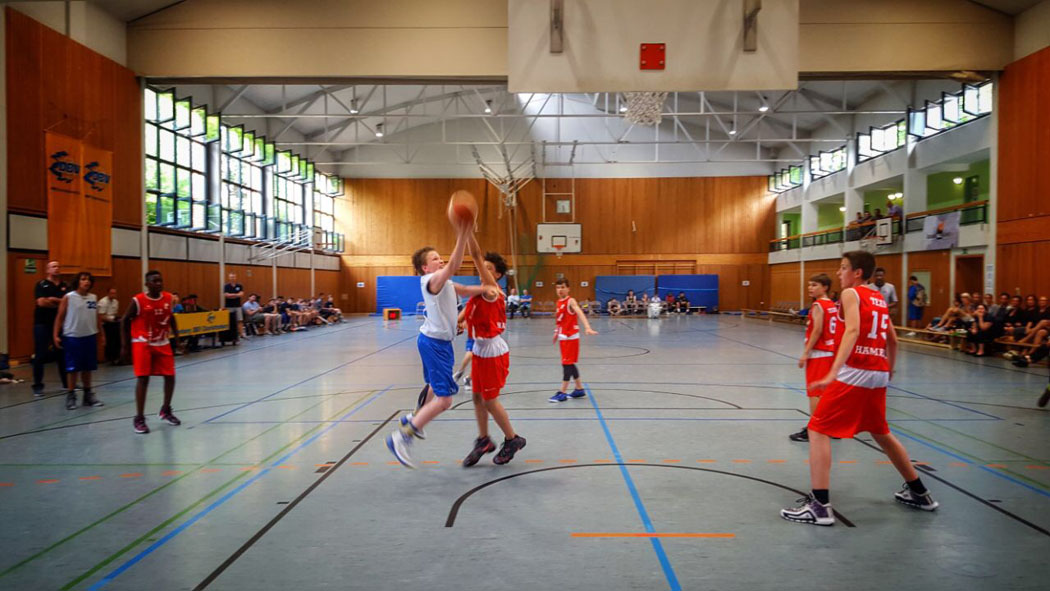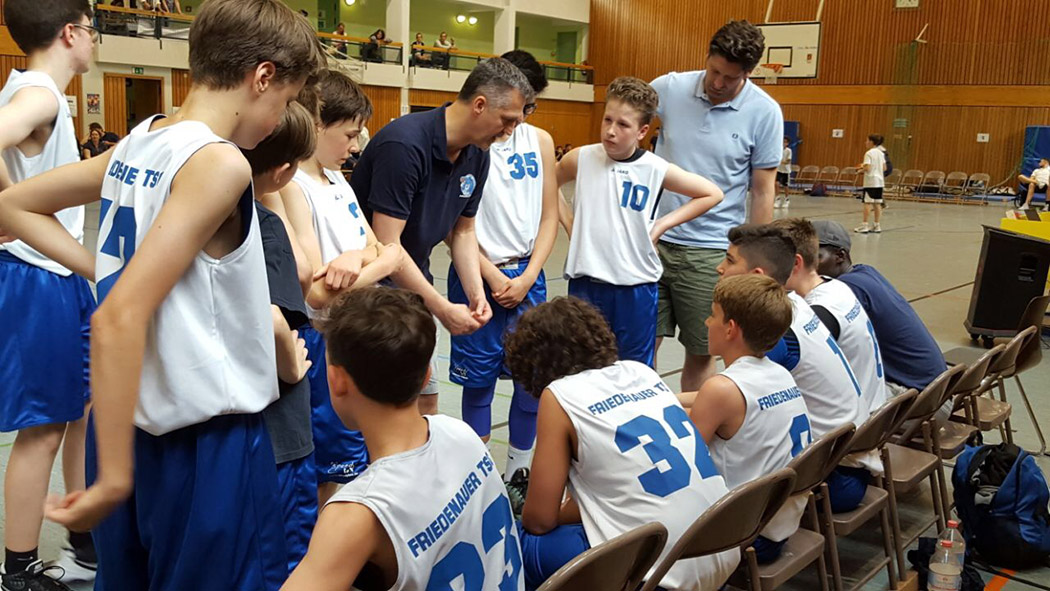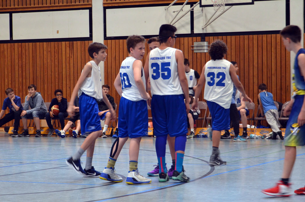 Im zweiten Spiel des Tages mühte sich unsere U14 dann gegen die Hamburg Auswahl 2004. Irgendwie verlief die Partie bis in die zweite Halbzeit hinein schleppend, nahm dann zum Ende hin aber ordentlich Fahrt auf. Beide Teams bearbeiteten sich mächtig, Friedenau lag bis kurz vor Schluss vorn, musste dann aber durch den Hamburger Spieler Nr. 10 einen 3-Punkte-Treffer zum Ausgleich hinnehmen. Verlängerung…