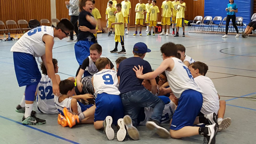 Hier behielt unser Team die Nerven, man könnte fast sagen „Nerven aus Stahl“. Eigentlich hatten die Hansestädter das Zepter in der Hand und lagen bis zur Schlusssekunde mit einem Punkt in Front. Aber eben nur bis zur Schlusssekunde: Pass von Nils auf Kaya, der wirft mit dem Abpfiff einen Buzzer-Beater mit Brett! Der Schütze rennt, wird aber im Mittelkreis eingeholt und schnell begraben unter einer Traube von jubelnden Spielern und Fans. Gänsehaut.