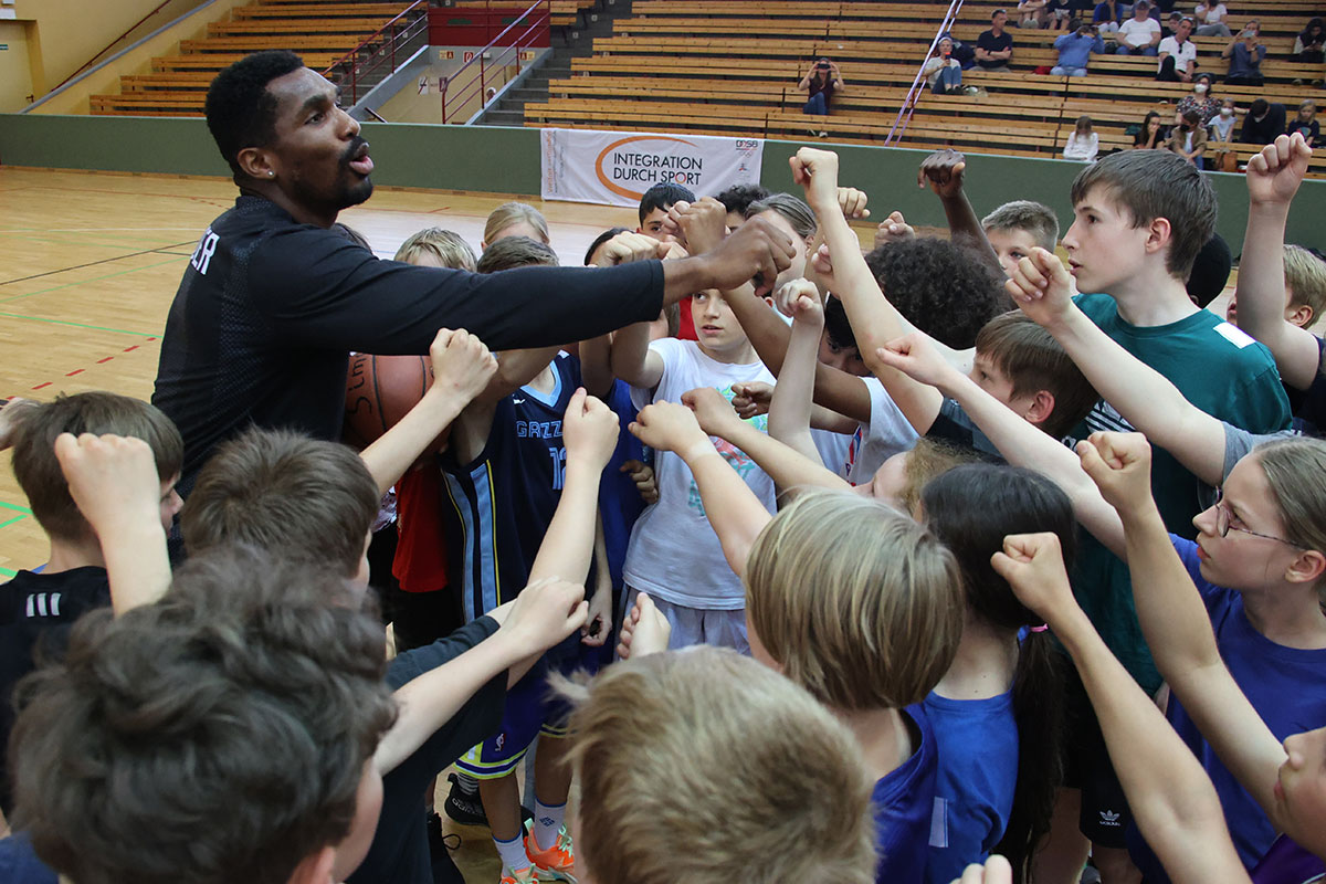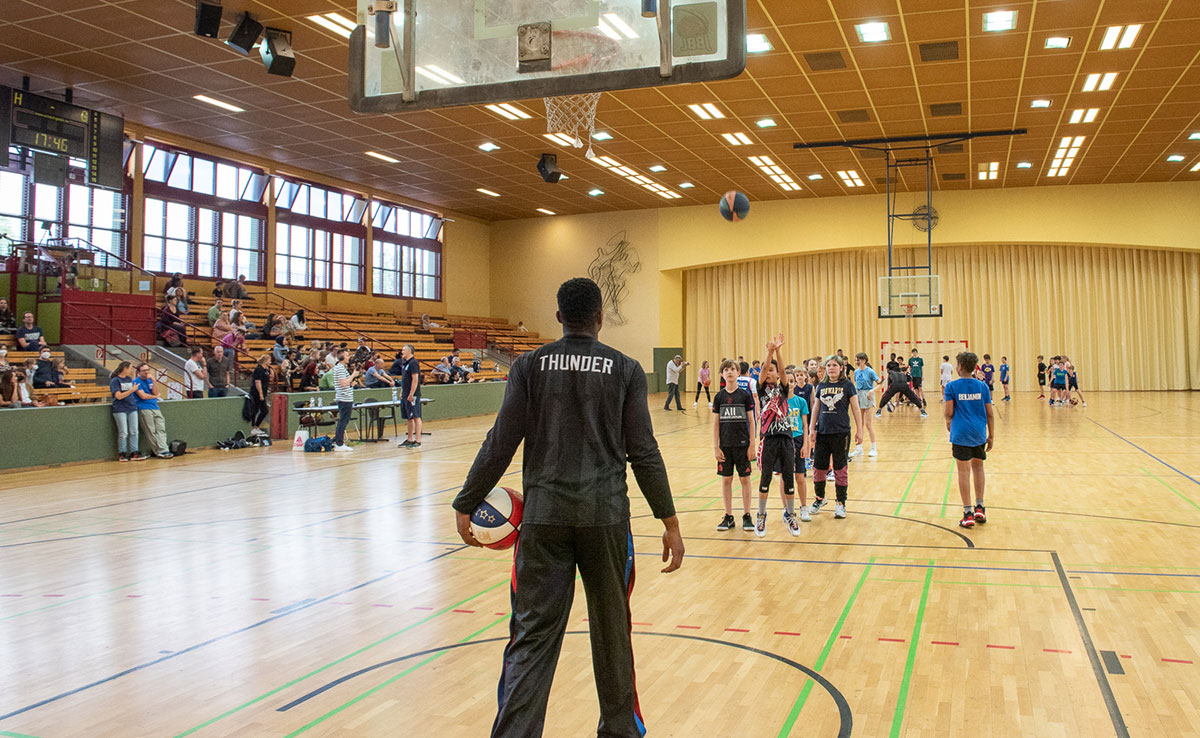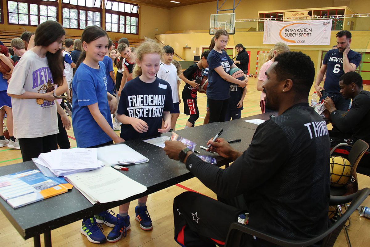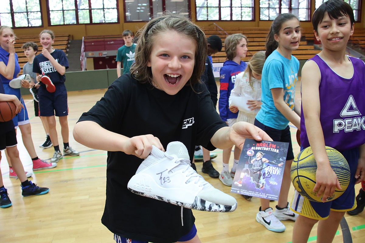 Sie besuchten die Nachwuchsbasketballer des Friedenauer TSC 1886 e. V., trainierten mit ihnen gemeinsam in der Schöneberger Sporthalle am Sachsendamm und gaben Kostproben ihres Basketballkönnens. Sie zeigten den 50 Kindern der männlichen und weiblichen U11- und U12-Teams Tricks, übten Korbwürfe und Dribblings.