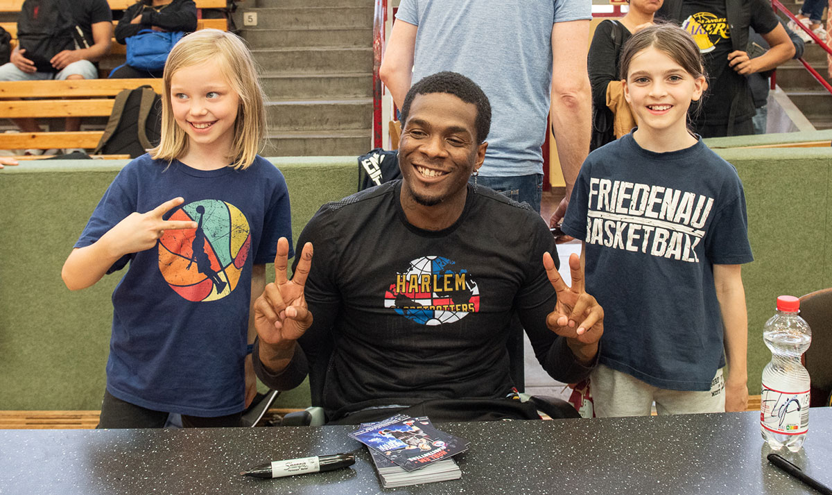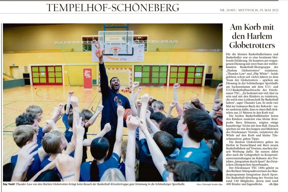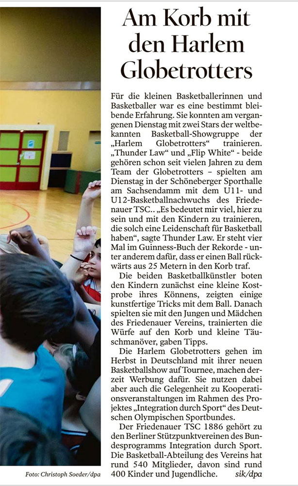Sie wollten auf diese Weise ein Zeichen für Integration durch Sport setzen. Die Harlem Globetrotters nehmen nicht nur eine besondere Stellung im Sport und in der Familienunterhaltung ein. Sie engagieren sich auch „für Gleichberechtigung, Integration und soziale Projekte“, wie sie in der Presseeinladung zum gemeinsamen Training mit dem Friedenauer TSC betonen.
