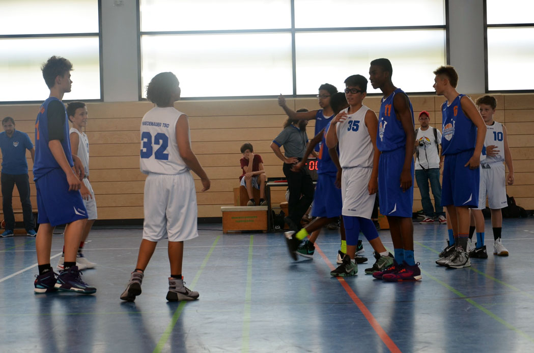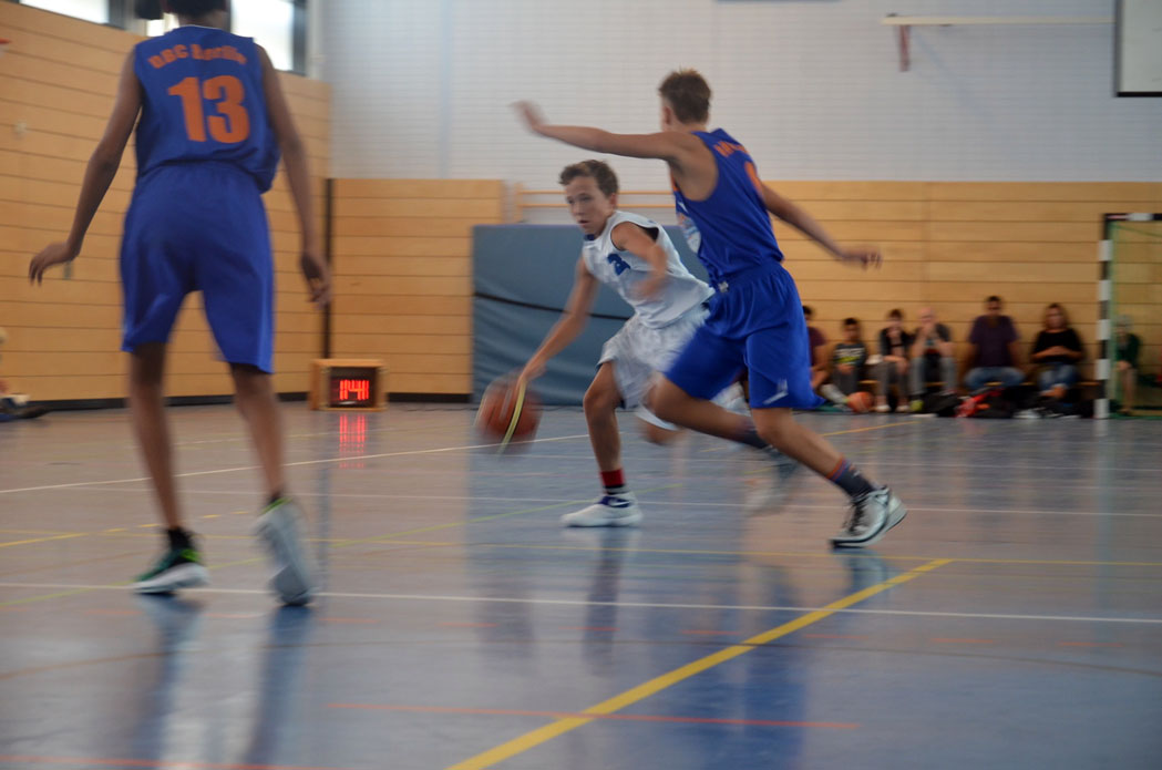 Unser Gegner war DBC Berlin 1. Die waren Dritter im Qualifikationsturnier. Ich denke mal, da hatten wir alle ziemlichen Respekt vor. Sie haben schon mit der Starting Five ihre Größe ausgespielt. Neben den vier großen Spielern sah sogar Elia klein aus.
