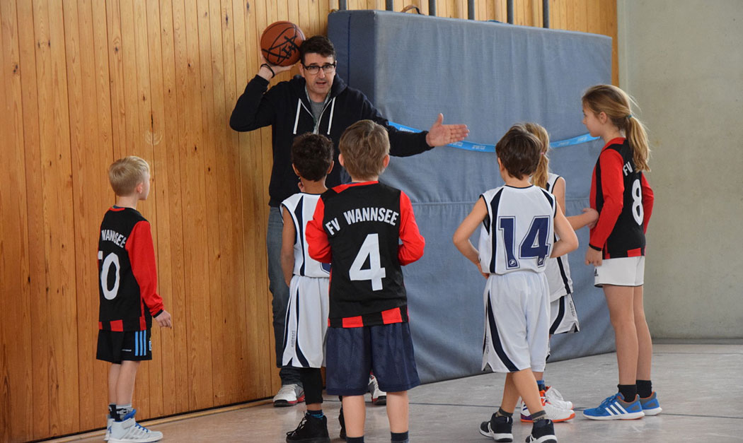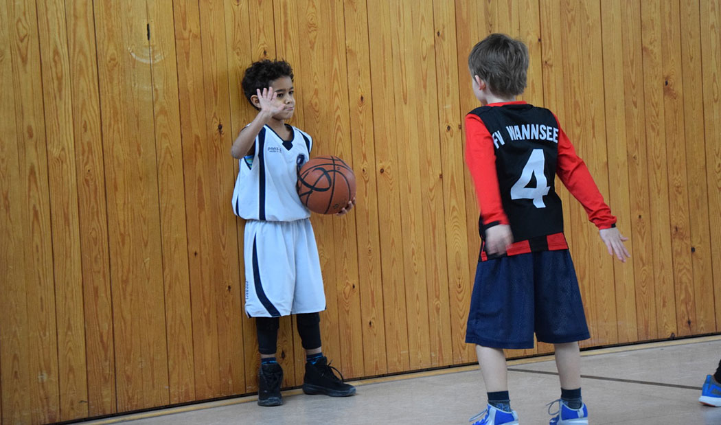 Achtzehn Stunden später. Die Trikots sind schon längst wieder gewaschen und die U8 macht sich auf nach Wannsee. Die Basketball AG der Conrad-Schule hat uns zu einem Freundschaftsspiel eingeladen. Schon beim Aufwärmen wird uns Coaches klar: Das ist nicht nur irgendeine Schul-AG. Das sind starke Gegner/innen! Wieder ist die Halle mit guter Laune gefüllt und es geht schneller los als die ersten Vier ihr Aufwärmshirt ausgezogen haben. Die Kinder sind sich einig, „Mist, da ist Ole!“ Tobi fragt mich wer Ole ist, ich frage mich, wer Ole ist. Nach dem ersten Zehntel wissen wir, wer Ole ist. Nicht nur Ole, das gesamte Team der Schul-AG ist in Topform! Die Kinder auf der Bank führen lebendige Gespräche über Spiel und Strategie: „Wir haben noch keinen Korb und die anderen schon Hunderte!“ „Na und, wir haben doch Spaß!“