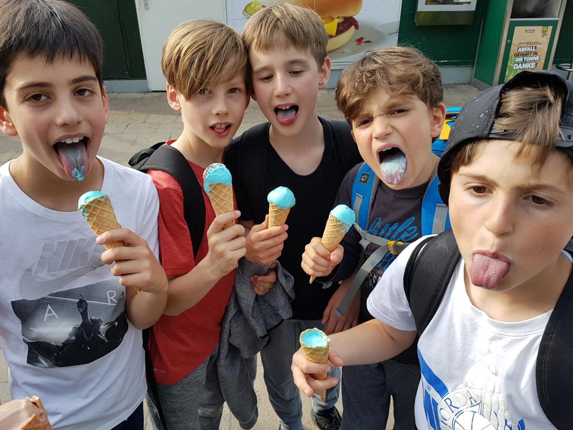 Nach der Siegerehrung, inklusive Pokal, Urkunde, Sneaker-Bag und einer Handvoll weiterer Goodies gibt’s Pizza, die die Jungs und Mädchen in der Sonne vor der Halle gemeinsam verschlingen. Dann geht’s zu Fuß durch ein unglaublich schönes Nord-Halle zur Tram und zurück zum Bahnhof. Hier noch’n Eis und dann in den ICE. Doch wer nun denkt, die Kids sind platt, der soll die Mitfahrenden aus Wagen 23 fragen.