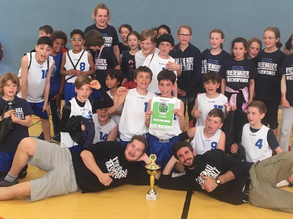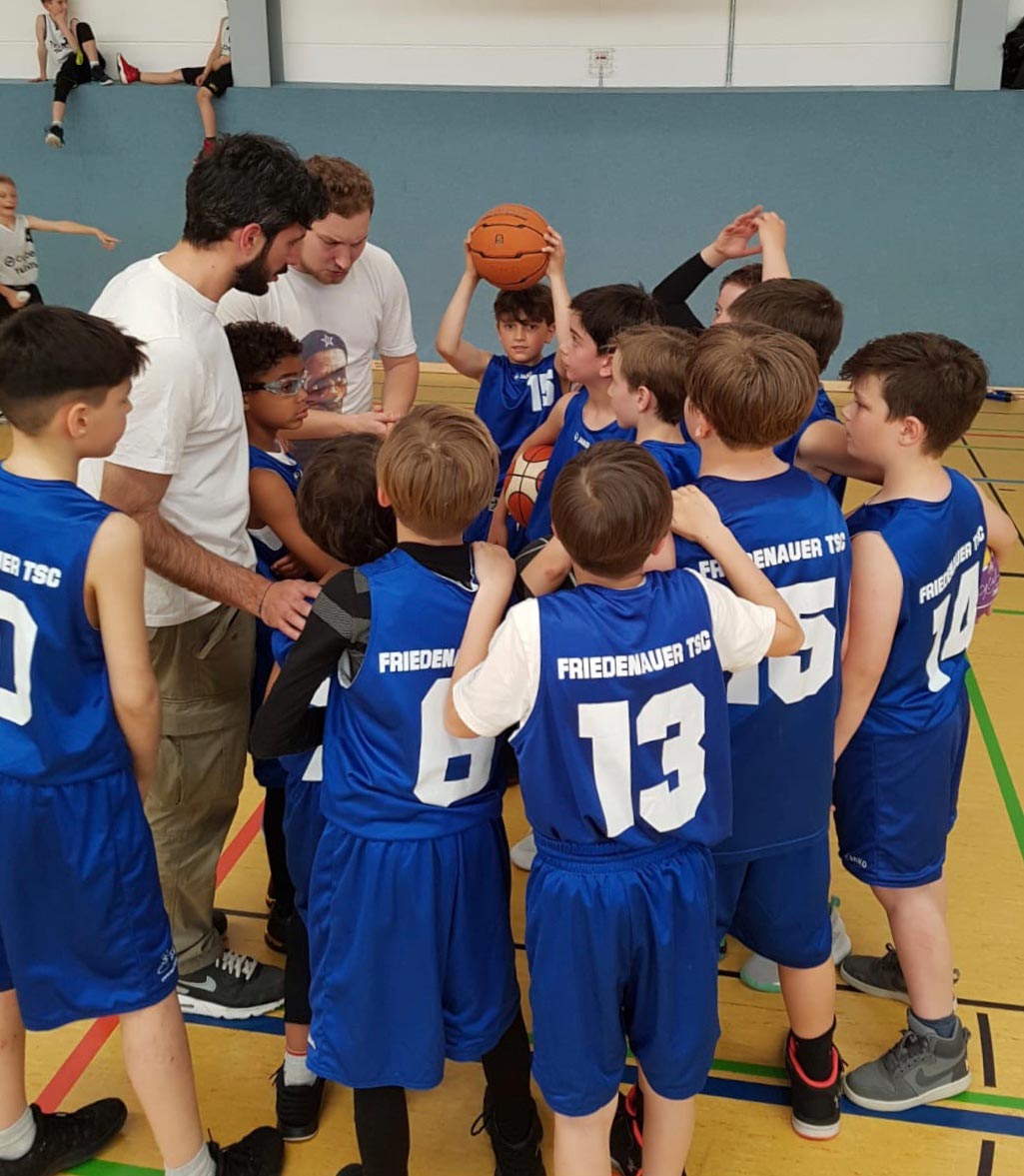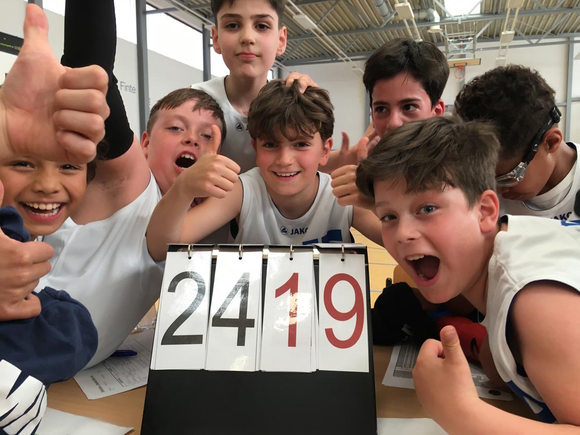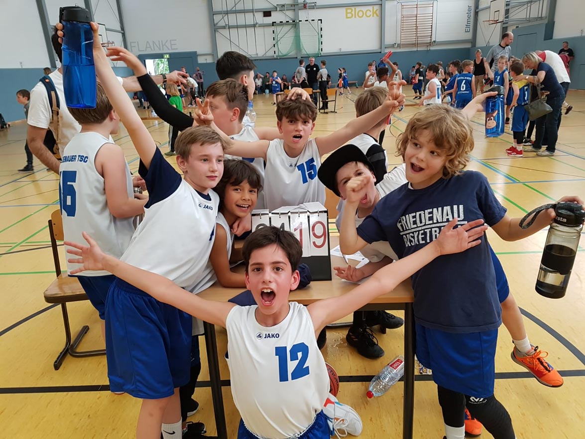 Als vor dem Anpfiff auch noch das Mädchenteam eintrifft, um die Jungs nach vorn zu peitschen, sind die Weichen gestellt. Jetzt gibt es nur noch ein Ziel: Den Pokal! Wieder gewinnt Lennard den Sprungball. Und diesmal glücken auch die ersten Korbleger. Eine schnelle 6:2-Führung ist da. Doch Gotha kämpft sich zurück. Bis zur Pause holen die Thüringer Punkt um Punkt, sodass die Coaches gefragt sind, die Kids an das „Wir sind stark, wir sind schlau …“ zu erinnern. Mit Wiederanpfiff lässt der TSC dann keine Zweifel mehr zu: Der Pott gehört nach Berlin. Und so spielt das Team dann auch. Mit stabiler Defense, mit Klasse-Steals, überragender Trefferquote und mit Super-Cheering durch die Mädchenmannschaft holen die Jungs das Ding mit 24:19 nach Hause.