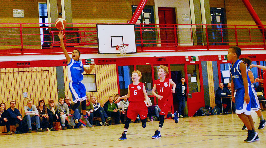 Jungs, aufwachen! Ihr habt doch die Möglichkeiten, nutzt sie! Im Sechsten sind es zunächst Richard und Lenny, die sich das zu Herzen nehmen und den Lankwitzer Ansturm auf den Friedenauer Korb mit schönen Punkten beantworten. Viele schöne Körbe, aber immer noch 11 Punkte hinten. Und so wogt das Spiel hin und her, die Mammuts mühen sich redlich, erarbeiten sich Chance um Chance, aber die Verwertung ist katatstrophal. Südwest dagegen versteht sich darauf, jeden noch so kleinen Fehler der Friedenauer eiskalt auszunutzen. Kompliment, sehr abgezockt! Und so geht es immer noch mit einem 10-Punkte-Rückstand ins neunte Zehntel. Jetzt oder nie, scheinen sich die kleinen Mammuts zu sagen, denn Deion, Lenny, Max und David legen los wie die Feuerwehr! Die Defense ist gegen Ende eines so intensiven und temporeichen Spiels natürlich nicht mehr die allerbeste, aber endlich werden aus Möglichkeiten auch Punkte! 17:10 endet dieses Zehntel, Friedenau ist auf drei Punkte dran! Das Abschlusszehntel wird gleich mal mit einem Korb von Mathéo eröffnet, nur noch ein Punkt! Wahnsinn! Die Mammuts haben zeitweise mit 15 Punkten zurück gelegen und sind wieder im Rennen! Doch die letzten Minuten dieses Spiels gehörten leider Südwest. Wieder wurde zu wenig aus den Möglichkeiten gemacht, die Lankwitzer dagegen punkteten sicher. Mit einem souveränen 11:4-Lauf stellten die Roten den Sieg sicher, Endstand 75:65 für Südwest. Gratulation, liebe Lankwitzer, ihr habt in einem tollen und sehenswerten Basketballspiel die Nerven behalten und trotz der Friedenauer Überlegenheit bei Rebounds und Wurfmöglichkeiten auf eure Chancen gewartet und diese einfach besser genutzt. Aber man sieht sich ja immer zwei Mal in der Saison … 🙂