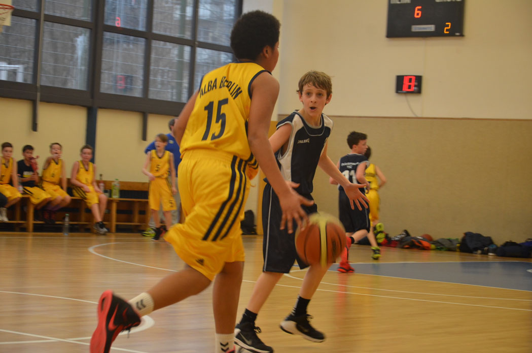 Auch im vierten ALBA-Spiel in dieser Saison hatte unsere U12 nicht ausreichend Fortune, um gegen die Albatrosse zu bestehen. Zwar präsentierte sich das Team im ersten Viertel stark in der Knaackstraße und konnte gut mithalten (16:16), doch das zweite Viertel wurde deutlich abgegeben. ALBA agierte nun mit einer recht tief stehenden Verteidigung, womit sich unsere Spieler schwer taten. Obendrein legten die Blau-Gelben einen 11:0-Lauf hin, bei dem unsere Jungs allzu oft Zuschauer waren und sich in dieser Phase nur mit unnötigen und zu vielen Fouls zu helfen wussten. Einzig Janis verteidigte überragend gegen ALBAs Spieler Nr. 15, der uns im Hinspiel mit 40 Punkten im Alleingang erledigt hatte. Janis gestattete ihm ganze acht Punkte, doch dafür sprangen diesmal ALBAs Bankspieler in die Bresche und sorgten für eine verdiente Halbzeitführung von 36:28.