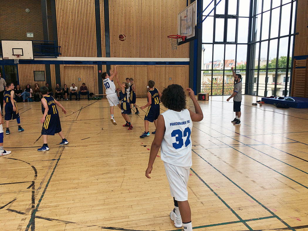 Während es am Samstag noch eine derbe Klatsche – 26:104 gegen die 2003er von ALBA 1 – gab, zeigte das Team am Sonntag Moral und erzielte den ersten Saisonsieg. Gegen die zweite Garde der 2003er von ALBA stimmte die Laufarbeit, es wurde gut zusammengespielt und intensiv verteidigt. Da das ALBA-Team körperlich nicht ganz so dominant war, wie die Mannschaft einen Tag zuvor, konnten unserer Friedenauer Jungs besser mithalten. Unterm Strich belohnte sich das Team so mit einem 54:49 und hat ein Ziel der Vorrunde bereits erreicht.