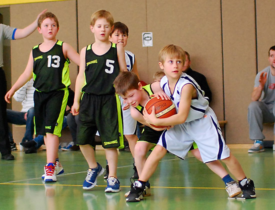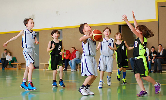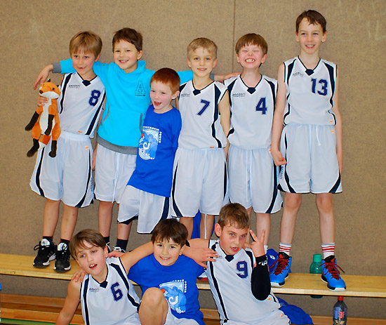 In der zweiten Hälfte konnte zunächst an die ordentliche Leistung angeknüpft werden. Bernau hielt nach Kräften dagegen, aber die Friedenauer Kids waren einfach hungriger und fingen immer öfter an umzusetzen, was wir in den vergangenen Trainings verstärkt geübt hatten: schnelles Passen nach vorne statt Dribbel-Arien. Zehntel Nr. sechs und sieben gingen erneut deutlich an die Mammuts. Um alle Friedenauer, Kinder wie Trainer wie Eltern, an die altbekannte „Schwäche“ dieses Teams zu erinnern, folgten drei Zehntel, in denen die kleinen Mammuts nicht ein einziges Mal mehr in den Korb trafen! Richtig gelesen: 3 Zehntel, 12 Minuten Spielzeit, 0 Punkte … Nicht etwa, dass das Team schlechter gespielt hätte, aber es fiel einfach keiner der der so fleißig bei Steals ergatterten und bei Rebounds gefangenen Bälle mehr ins Netz. Beruhigender Weise war der Vorsprung so groß und der Einsatz der Kids ansonsten weiterhin so toll, dass die Bernauer in diesen drei Zehnteln auch „nur“ fünf Körbe machen und den Endstand auf 27:49 aufhübschen konnten.