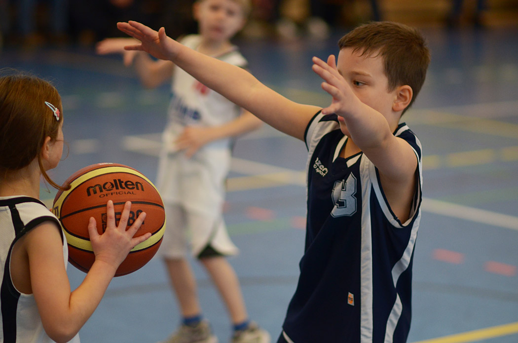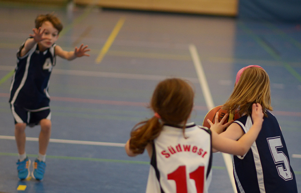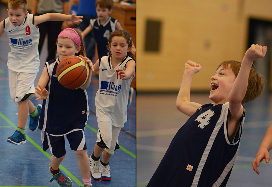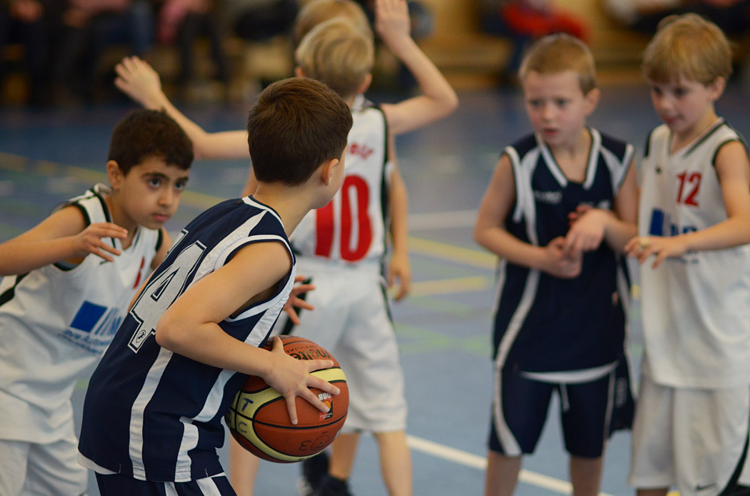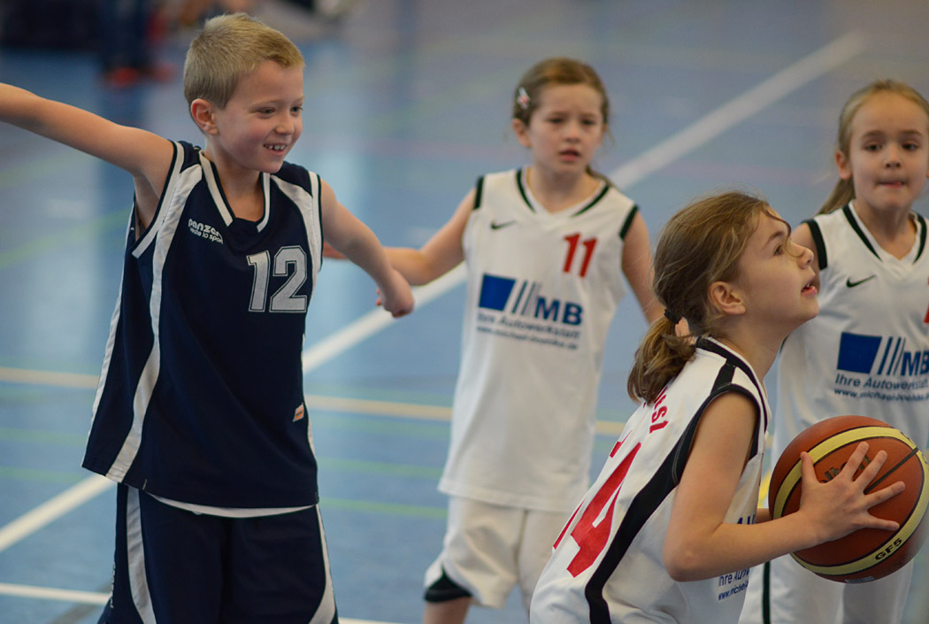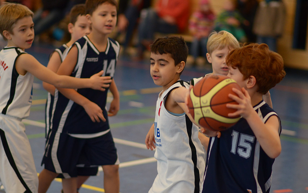 In der zweiten Halbzeit verteidigten die kleinen Mammuts noch intensiver und eroberten noch mehr Bälle. Erik traf endlich in den Korb, Kai klaute noch mehr Bälle und Liam holte einen Defensivrebound, dribbelte mutig nach vorne und traf seinen ersten Korb in einem Punktspiel! „From coast to coast“, wie man im Basketball sagt. Und im nächsten Zehntel machte Joel es ihm gleich nach und markierte seinen ersten Feldkorb! Angesichts des Spielstandes von 26:5 gab der Coach im letzten Zehntel dann die Devise aus: Kein Dribbling mehr, nur noch Passen und Laufen! Und auch diese Aufgabe lösten die Mammuts mit Bravour, der Ball flog nur so von einer Friedenauer Hand in die nächste, ein wahrer Augenschmaus! Lediglich die Trefferquote ließ wieder etwas zu Wünschen übrig, aber Lukas sorgte mit einem schönen Korb für den 28:5-Endstand.