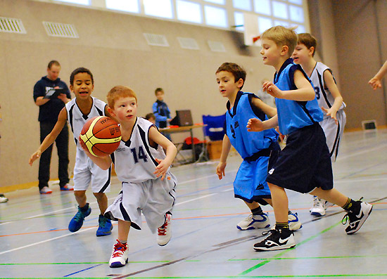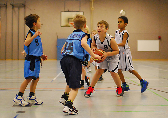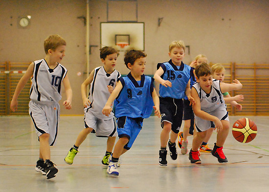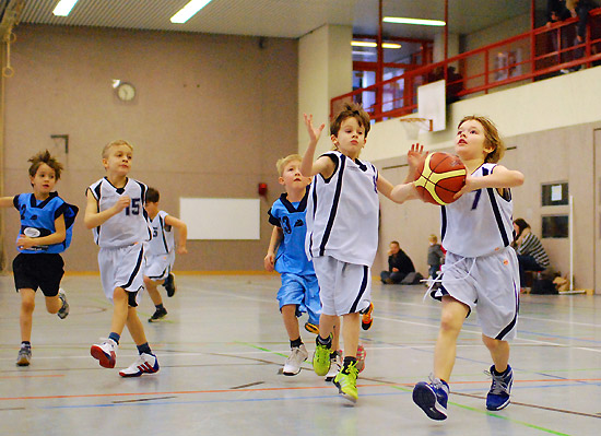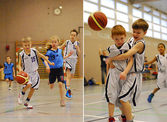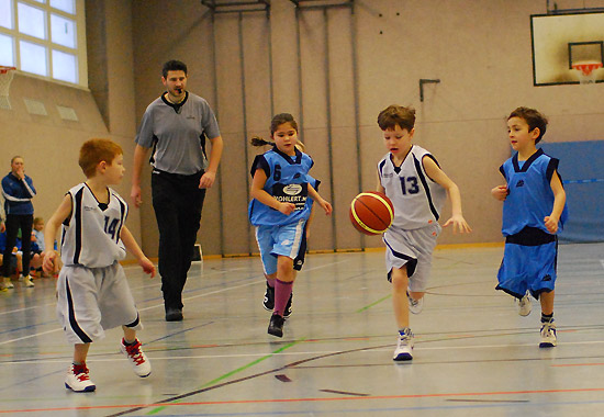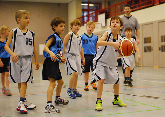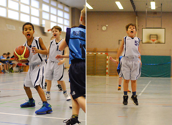 Wie toll dieses Team zusammengewachsen ist, zeigte sich besonders im letzten Zehntel: Eine kurze Ansage des Coaches reichte („Jungs, Milan und Julius haben noch keinen Korb geworfen …!“), und alle wussten, was zu tun war. Den Ball sicher nach vorne bringen, den sauberen Pass auf den freistehenden Mitspieler spielen … Treffer! Das Ganze dann gleich nochmal … Treffer! Thema erledigt! Unserer besonderer Glückwunsch geht also an Milan für sein tolles erstes Spiel, bei dem er gleich einen Korb warf und einen Freiwurf versenkte, sowie an Julius, der quasi „auf Befehl“ im letzten Zehntel seinen ersten Feldkorb überhaupt traf! Und natürlich an unseren Kleinsten Erik, der seine ersten beiden Körbe auf die hohe Korbanlage traf!