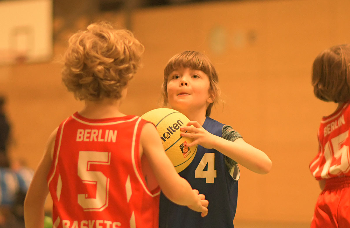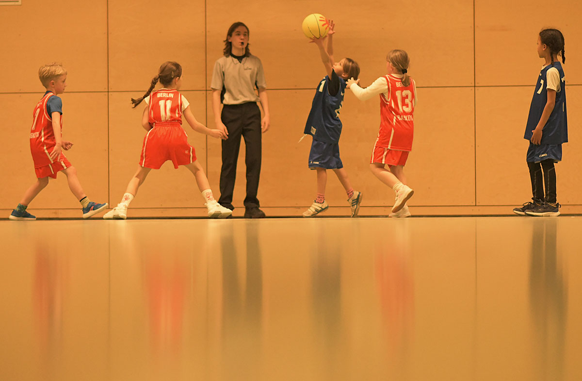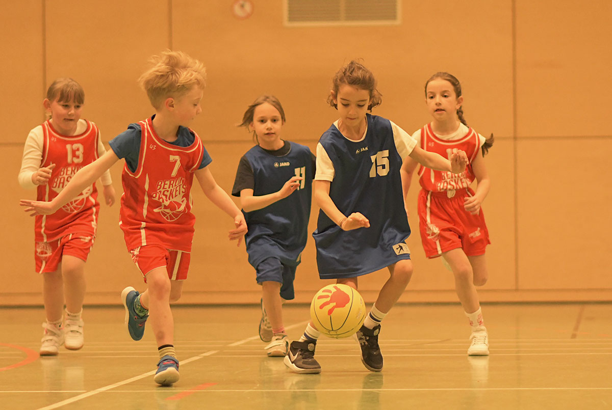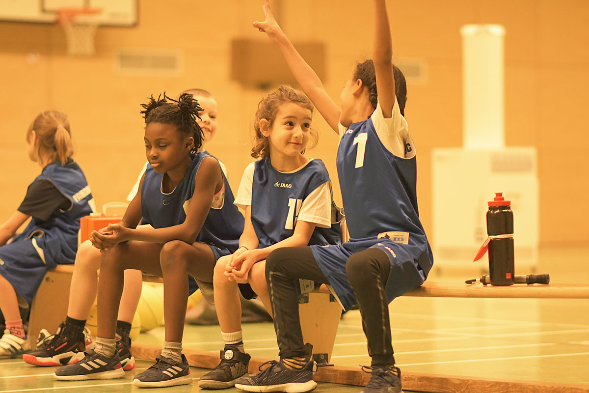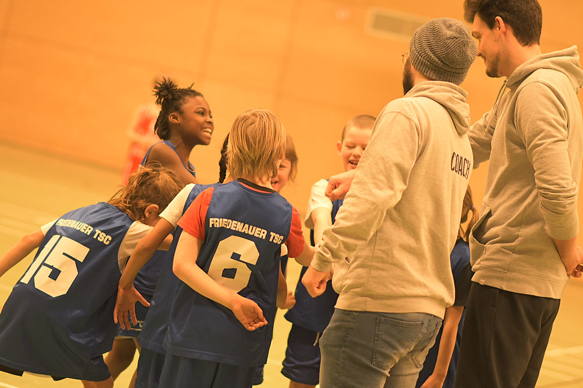 Auch die zweite Hälfte verlief insgesamt deutlich ausgeglichener. Die Mammuts verteidigten weiterhin mit mehr Disziplin und entwickelten auch im Angriff mehr Zug zum Korb. So schafften es die Kinder immer wieder, sich in aussichtsreiche Wurfpositionen zu bringen, was mit drei weiteren Treffern belohnt wurde. Vor allem aber an der lautstarken Unterstützung von der Bank ließ sich erkennen, dass die Mammuts nun mit vollem Feuer im Spiel waren: Die gesamte zweite Hälfte lang hallte der Schlachtruf „Weiß-Blau-Friedenau!“ ununterbrochen durch die Halle.