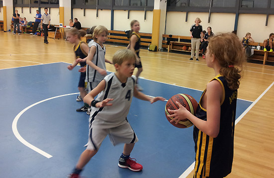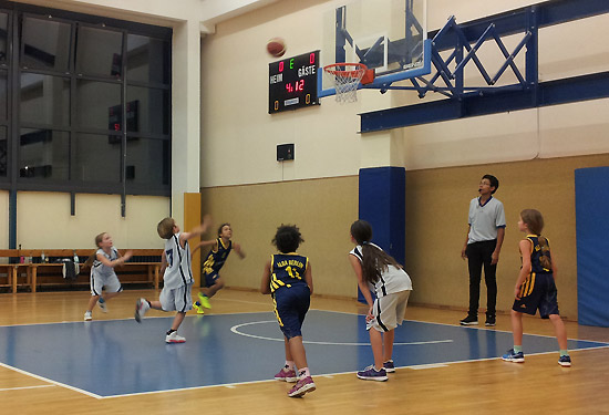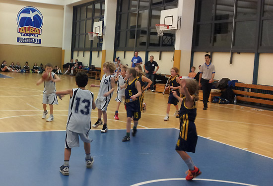 Am Nikolaustag stand für die U9 ein Gastspiel bei der Mädchen-Mannschaft von ALBA Berlin an, die jedoch am selben Tag von der Fortgeschrittenen- in die Anfänger-Staffel wechselte. So hatte das Spiel keinen offiziellen Charakter mehr, stellte aber aus mehreren Gründen dennoch eine interessante Herausforderung dar, fehlten beim TSC doch zwei Leistungsträger, da sie mit der U10 beim Nikolausturnier spielten, andere waren leider kurzfristig erkrankt. Dazu kamen interessante Ersteinsätze (Feuertaufe für Hannah und alle drei Mädels erstmalig zusammen auf dem Spielfeld!) und angesichts der dünnen Personaldecke erstmalig der Einsatz von zwei U8-Spielern in der U9 (Deion und Richard). Kurz gesagt: Alle haben sich super eingebracht und zum doch deutlichen Sieg gegen die zugegebener Maßen noch unerfahrenen ALBA-Mädchen beigetragen. Hannah kam zum ersten Mal aufs Feld und machte gleich mal zwei Körbe! Sie zeigte sich völlig unaufgeregt, zog energisch zum Korb und machte ihre Sache einfach toll! Auch Sonja und Emilia schienen den ungewohnt hohen weiblichen Spieleranteil in der Halle zu genießen und spielten unbefangen auf, griffen beherzt zu und punkteten. Die Youngsters aus der U8 brachten sich dazu so produktiv ein, als gehörten sie schon lange zum Team. Die bewährten Kräfte Ben, Nils und Daniel trugen natürlich das Team und ließen sich durch die ungewohnte Besetzung überhaupt nicht aus dem Konzept bringen. Und bis auf Kutay, der zur Hälfte leider mit Bauchschmerzen nach Hause gehen musste (gute Besserung!), haben alle Spieler gepunktet! Im letzten Zehntel fehlte nur noch ein Korb von Paolo – eine kurze Ansage reichte, die Jungs gingen aufs Spielfeld, Paolo stand frei unter dem gegnerischen Korb, Pass von Ben, reingemacht! Toll!