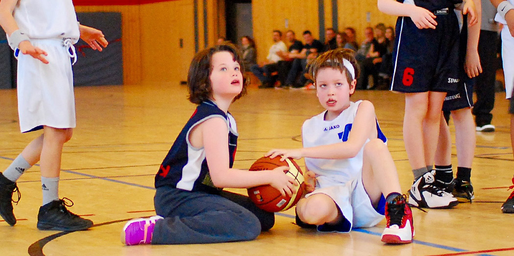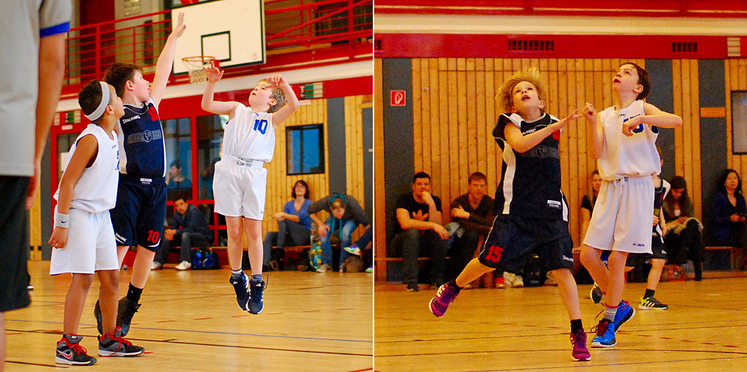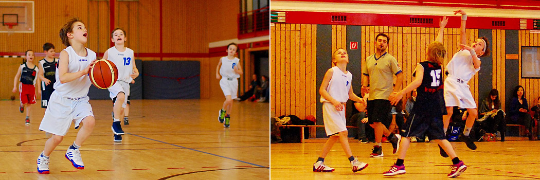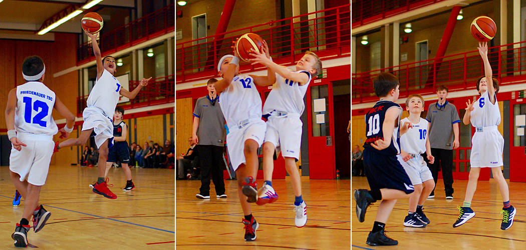 Willkommen an den Radiogeräten, liebe Basketballfreunde, wir berichten live vom Spiel in der U9A, der Friedenauer TSC empfängt BBC90 Köpenick. Schon geht es munter los auf dem Parkett, Köpenick kann 4:0 in Führung gehen, bevor den Friedenauern durch Caine der erste Korb gelingt. Das zweite Zehntel beginnt, und der TSC scheint jetzt richtig in Fahrt zu kommen. Lenny und Deion können punkten, jetzt bekommt Julius zum ersten Mal unter dem Korb an den Ball, und auch er triftt auf Anhieb! Es steht 14:4 für Friedenau. Köpenick versucht jetzt dagegen zu halten, eine Körbeflut wie im Zweiten können Sie verhindern, nur Felix und Alex von Friedenau können 5 Punkte erzielen, es steht 19:4. Ist die Sache hier schon gelaufen? Die Spieler kommen zum vierten Zehntel aufs Feld, und jetzt sind es die Köpenicker, die sich in einen Rausch spielen. Acht Mal fällt der Ball durch den Friedenauer Korb, ein 16:0-Lauf, Köpenick führt! Wie reagieren die Mammuts? Lassen sie sich beeindrucken? Ganz im Gegenteil! Sie haben sich von dem Schrecken erholt und drängen nun ihrerseits nach vorne, erobern sich Ball um Ball, sammeln Rebound um Rebound und verwandeln vorne sicher ihre Würfe – und zwar alle vier! Lenny, Felix, Alex und Caine schicken die Köpenicker mit einem 20:0-Lauf in die Halbzeitpause.