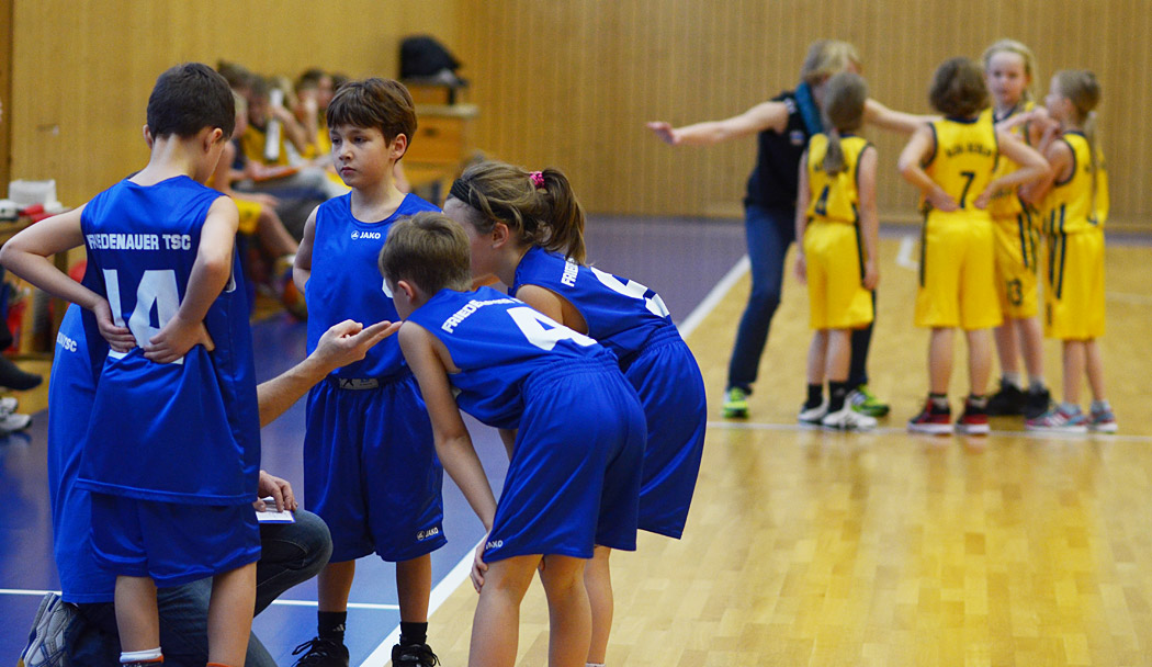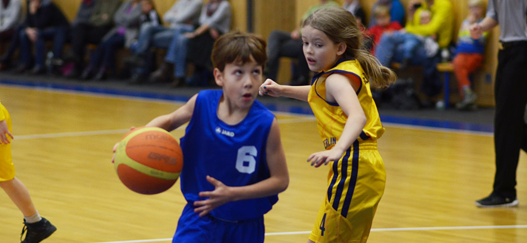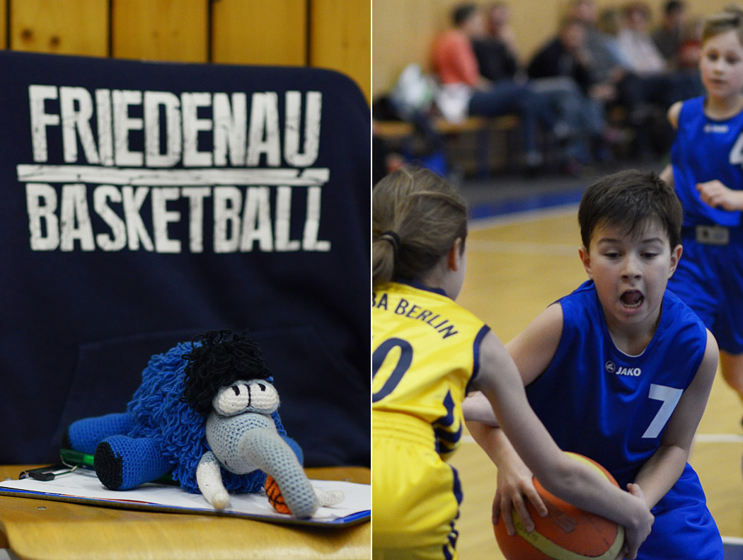 Mit dem Team Alba Berlin 3 stand der U9A von Friedenau erstmals ein reines Mädchen-Team gegenüber. Doch wer denken sollte, dass es das für die Mammuts leichter machen sollte, sah sich schnell getäuscht: Die Alba-Mädels waren hellwach und verteidigten energisch. Die Mammuts waren ein wenig verunsichert und hatten zweitweise arge Probleme den Ball zu fangen. In der Verteidigung waren sie dafür ebenso wach und konnten schließlich mit 2:0 in Führung gehen. Um das Fangen zu üben wurde den Friedenauern vom Coach gleich im zweiten Viertel mal das Dribbeln verboten. Was dabei heraus kam, war ein wunderschönes Pass-Spiel, nur fanden die Würfe immer noch nicht so oft ins Netz. Spielstand: 4:2 für den TSC. Doch dann schlug die Stunde des Alex S. Beim Aufwärmen noch ziemlich schlapp, zündete er jetzt endlich seine Raketenschuhe und klaute den Alba-Mädels ein ums andere Mal den Ball. Dann traf er auch noch einen Swish in den Korb, und auch Febe und Lennox konnten punkten, die Mammuts setzten sich erstmals ab. Na gut, was Alex kann, können wir schon lange, dachten sich Ragnar und Julis und angelten sich im vierten Zehntel einen Steal nach dem anderen. Fast alle Friedenauer auf dem Feld punkteten in diesem Spielabschnitt, mit einem 8:0-Lauf konnten die Mammuts die Führung auf ein beruhigendes 18:2 ausbauen. Im fünften Zehntel gabs dann wieder mal ein Dribbelverbot, und die Friedenauer brachten den Ball mit schönem Passspiel unter den gegenerischen Korb. Pausenstand: 22:2.
