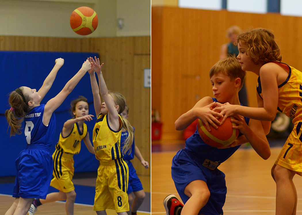 Von da an ließen die kleinen Mammuts nichts mehr anbrennen. Mit sehr aufmerksamer Verteidigung und einer Unmenge an Steals wurde der Vorsprung ausgebaut – lediglich im siebten Zehntel konnten die Alba-Mädels mit einem 4:2 den Abstand verkürzen. Bei Friedenau aber zeigte sich mal wieder der tolle Teamgeist, das gute Zusammenspiel und der unstillbare Ballhunger. Ob mit oder ohne Dribblings, die Kinder behielten Nerven, spielten sehr schön zusammen und brachten sich alle toll ein. Von Febe angefangen, die als einziges Mädchen im Team wieder mal ganz unerschrocken dabei war und schon wieder punkten konnte (Kompliment!), über die beiden U8-Aushelfer Lennox und Lukas, die sich ein ums andere Mal tadellos integrieren und wertvolle Mitspieler sind, bis zu Julius, der sich immer mehr zutraut, imer selbstbewusster auftritt und zwei tolle Körbe erzielte. Ganz zu schweigen von einem Ragnar, der immer wieder durch seinen tollen Einsatz in der Defense auffällt und sich im Angriff immer mehr Rebounds mutig angelt, einem Alex und einem Milan, auf die einfach immer Verlass ist, wenn es um Defense und Korbleger geht, einem Leo, der leider heute nicht punkten konnte, aber in der Defense immer beherzt zupackt, zuckersüße Pässe spielt und immer an der richtigen Stelle steht, und einem Lenny, der an allen Enden des Feldes auftaucht, Rebounds holt, alle Gegner schwindelig dribbelt und immer die Übersicht für sein Team behält. Endstand: 40:6 für den TSC.
