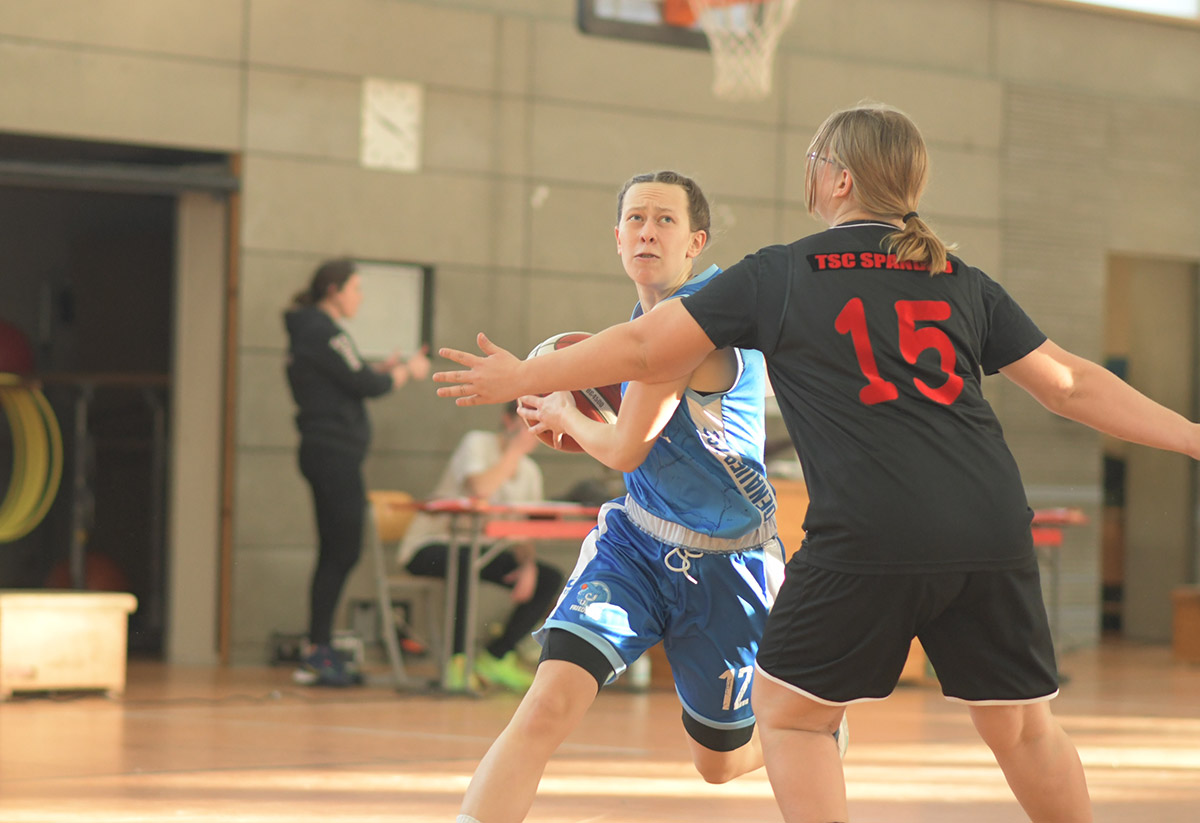 Erster Gegner: Auswärtsspiel beim TSC Spandau. War ein bisschen wie Klassenfahrt. Bei herrlichstem Sonnenschein ging es in zwei Autos in die Spandauer Ferne, wo eine tolle Halle und ein sehr freundlicher und kompetenter Schiedsrichter auf uns warteten – und ein Team, gegen das wir im Hinspiel mit 15 Punkten verloren hatten! Erste gute Nachricht: Die Topscorerin von damals ist mittlerweile bei Alba. Aber das kümmerte unsere Mammut-Mädels ohnehin kaum, denn sie legten los wie die Feuerwehr. Mit starken Aktionen zum Korb und gutem Passspiel wurde schnell die erste Führung herausgespielt, erst Mitte des ersten Viertels gelang den Spandauerinnen der erste Korb. Leider schienen sich unsere Ladies da schon ein wenig zu sicher zu fühlen, denn die Intensität in der Defense nahm merklich ab, und Spandau konnte bis zur Viertelpause auf 20:16 herankommen.